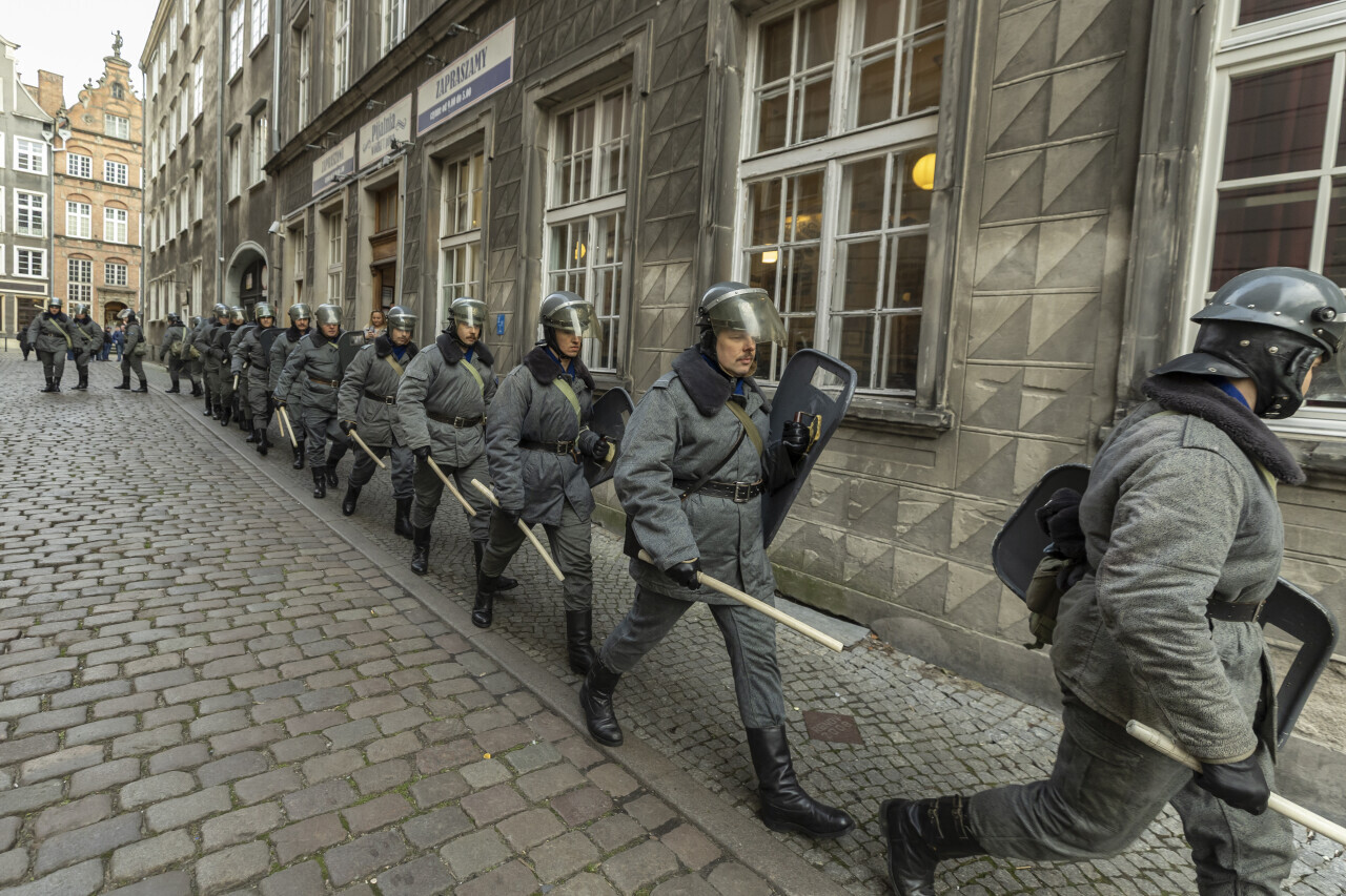Gdańsk. Stan Wojenny - inscenizacja historyczna na Długim Targu.