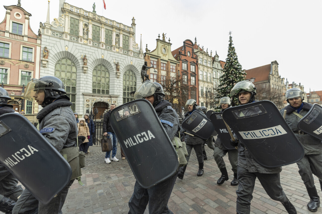 Gdańsk. Stan Wojenny - inscenizacja historyczna na Długim Targu.
