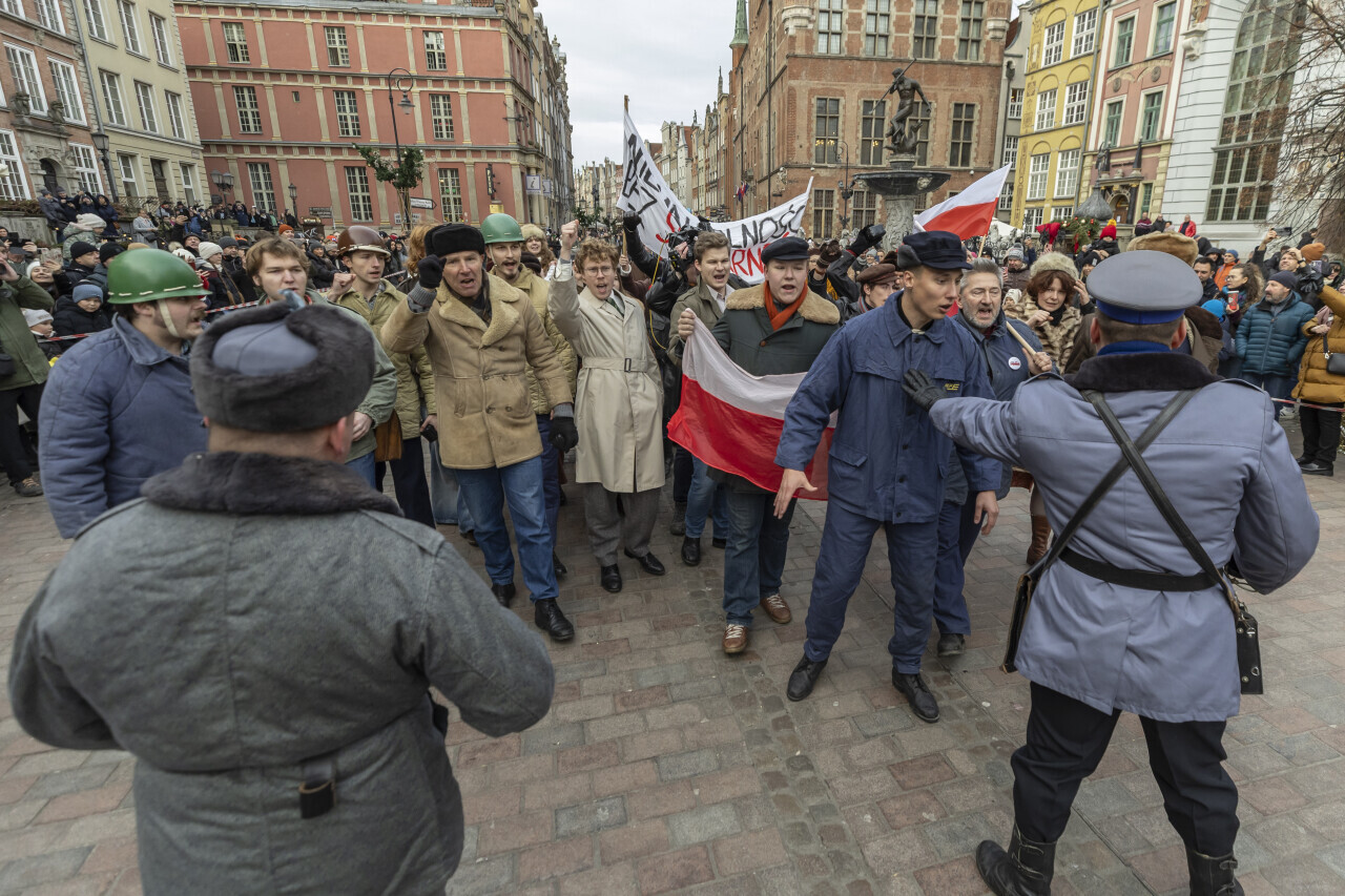 Gdańsk. Stan Wojenny - inscenizacja historyczna na Długim Targu.