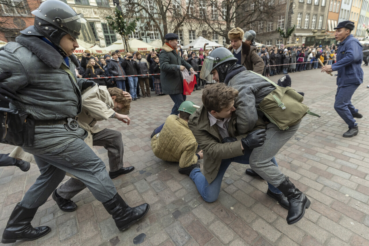 Gdańsk. Stan Wojenny - inscenizacja historyczna na Długim Targu.