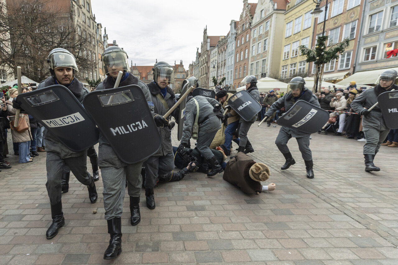 Gdańsk. Stan Wojenny - inscenizacja historyczna na Długim Targu.