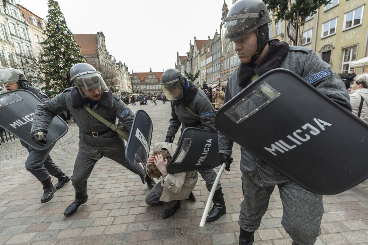 Gdańsk. Stan Wojenny - inscenizacja historyczna na Długim Targu.