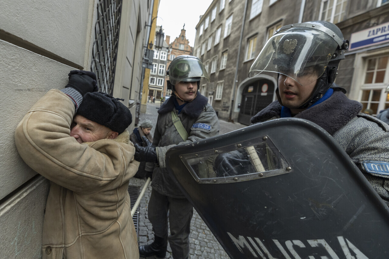 Gdańsk. Stan Wojenny - inscenizacja historyczna na Długim Targu.