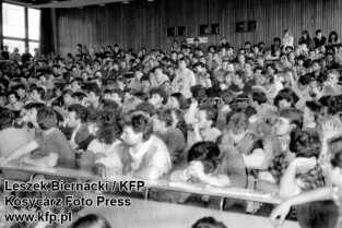 Gdańsk. Strajk majowy na Uniwersytecie Gdańskim, Wydział Humanistyczny. Wiec kończący strajk w auli "Humany". 05.1988