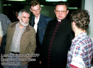 Gdańsk. Strajk majowy na Uniwersytecie Gdańskim, Wydział Humanistyczny. Od lewej: Konrad Maruszczyk, nn, ks. Henryk Jankowski, Przemysław Gosiewski. 05.1988
