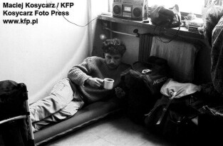Strajk studencki na Uniwersytecie Gdańskim. Wydział Humanistyczny. Przedostatni dzień strajku. Student w miejscu gdzie spał podczas strajku. 04.05.1988