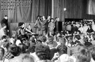 Strajk studencki na Uniwersytecie Gdańskim. Aula Wydziału Humanistycznego. Przedostatni dzień strajku. Przy stoliku prezydialnym siedzi z mikrofonem Przewodniczący Komitetu Strajkowego Paweł Adamowicz i członek komitetu Mariusz Popielarz, przed nimi siedzi w koszuli w kratę inny członek Komitetu Strajkowego Przemysław Gosiewski, drugi za nim w prawo Andrzej Sosnowski tez członek Komitetu Strajkowego. 04.05.1988