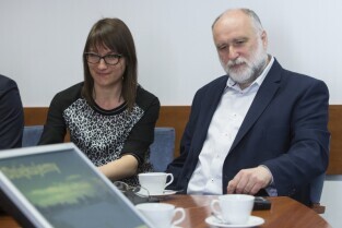 Urząd Miejski w Gdańsku. Przekazanie opracowanej "Strategii Rozwoju Terenów Nadwodnych w Gdańsku” Prezydentowi Gdańska Pawłowi Adamowiczowi przez członków warsztatów projektowych z Holandii. Nz. Prezydent Gdańska Paweł Adamowicz, obok Z-ca Prezydenta Gdańska Wiesław Bielawski