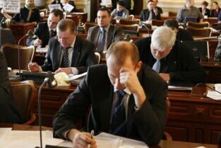 Gdańsk, Nowy Ratusz. Styczniowa sesja Rady Miasta Gdańska. Nz. radny Lech Kaźmierczyk