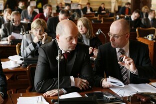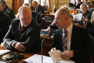 Gdańsk, Nowy Ratusz. Styczniowa sesja Rady Miasta Gdańska. Nz. Przewodniczący Klubu PiS Kazimierz Koralewski (po prawej) i radny Paweł Jaworski