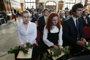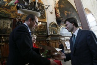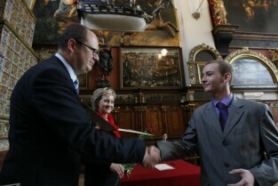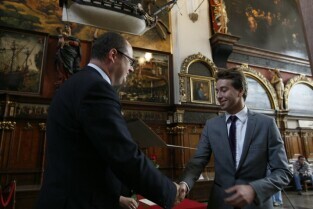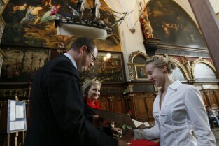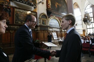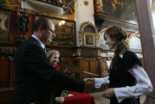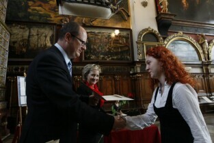 Uroczystość wręczenia stypendiów im. Gabriela Daniela Fahrenheita, które otrzymują gdańszczanie studiujący na zagranicznych uczelniach. Gdańsk, Dwór Artusa