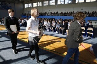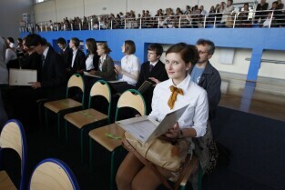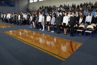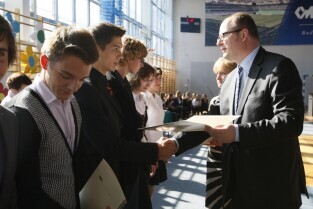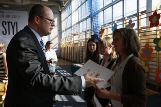 Prezydent Gdańska Paweł Adamowicz wręcza stypendia najzdolniejszym gdańskim uczniom szkół podstawowych i ponadpodstawowych. Gdańsk Chełm, Gimnazjum nr 3.