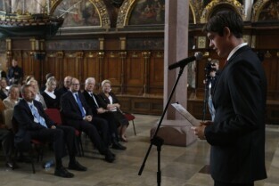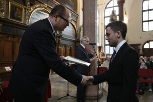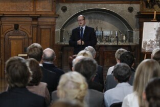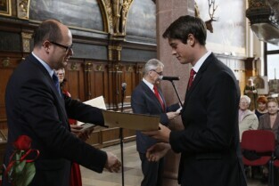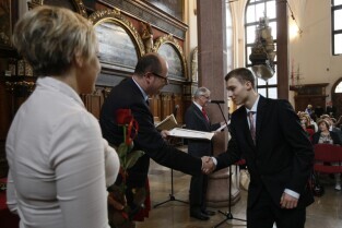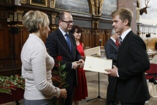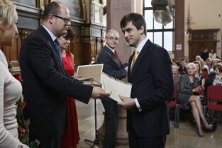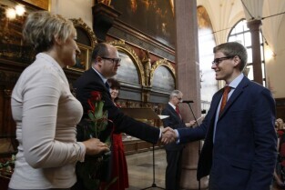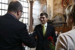 Prezydent Gdańska Paweł Adamowicz wręcza dyplomy stypendystom im. Daniela Fahrenheita, którymi są gdańszczanie - studenci zagranicznych uczelni. Gdańsk, Dwór Artusa.