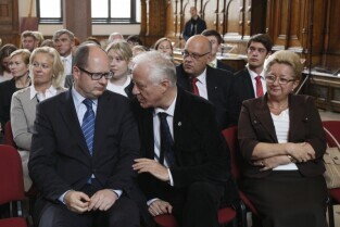 Prezydent Gdańska Paweł Adamowicz wręcza dyplomy stypendystom im. Daniela Fahrenheita, którymi są gdańszczanie - studenci zagranicznych uczelni. Gdańsk, Dwór Artusa. Nz. od lewej: Prezydent Gdańska Paweł Adamowicz, Przewodniczący Kapituły Stypendium Fahrenheita Janusz Limon, Z-ca Prezydenta Gdańska Ewa Kamińska