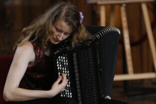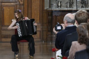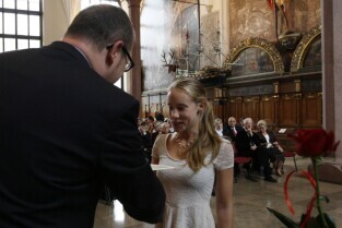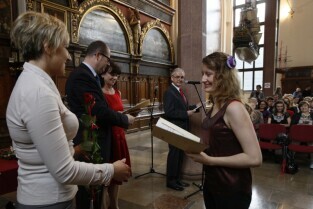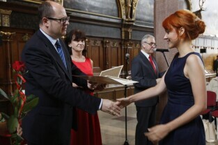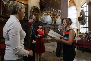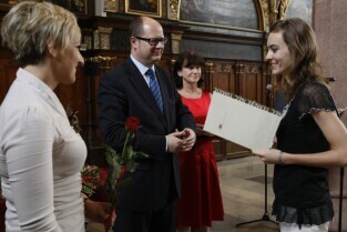 Prezydent Gdańska Paweł Adamowicz wręcza dyplomy stypendystom im. Daniela Fahrenheita, którymi są gdańszczanie - studenci zagranicznych uczelni. Gdańsk, Dwór Artusa. Nz. Barbara Sławińska, jedna z tegorocznych stypendystek