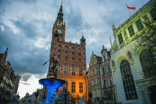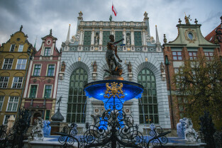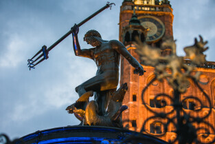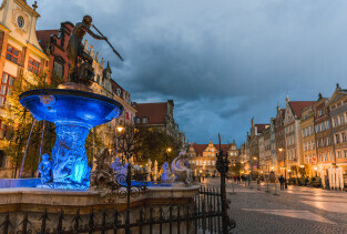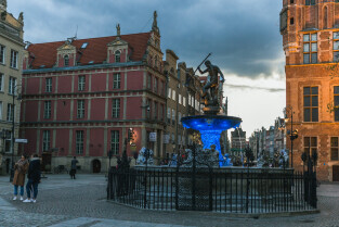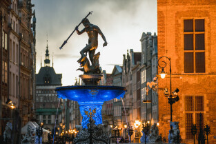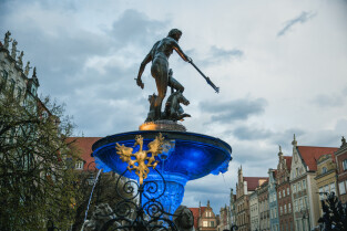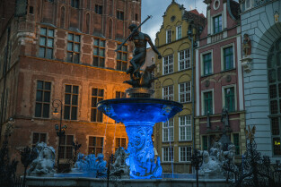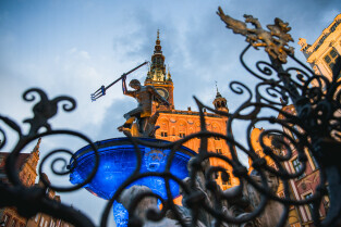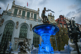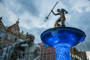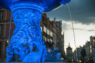 Gdańsk, Fontanna Neptuna. Światowy Dzień Nadciśnienia Płucnego. Gdański Neptun podświetlony na niebiesko. To wyraz solidarności z cierpiącymi na nadciśnienie płucne