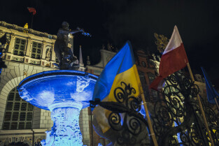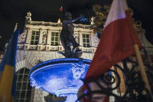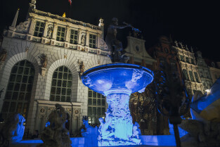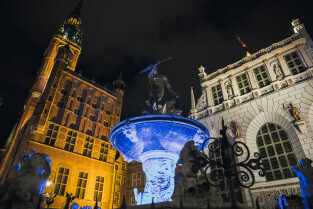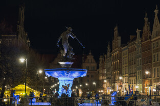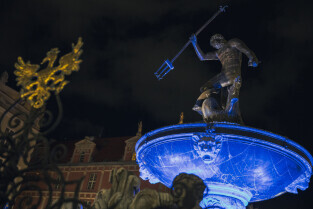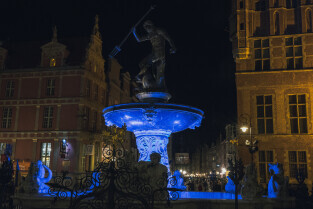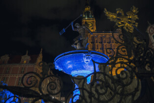 Gdańsk, Długi Targ. Światowy Dzień Świadomości Autyzmu. Fontanna Neptuna podświetlona na niebiesko