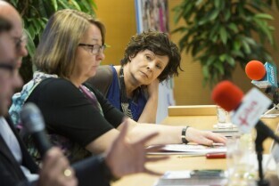 Ośrodek Kultury Morskiej w Gdańsku. Konferencja prasowa poświęcona organizacji IV Światowego Zjazdu Gdańszczan. Nz. od prawej: Dorota Kolak, Dyrektor Biura Prezydenta Gdańska ds. Kultury Anna Czekanowicz-Drążewska, Prezydent Gdańska Paweł Adamowicz, Z-ca Dyrektora Wydziału Rozwoju Społecznego UMG Grzegorz Szczuka