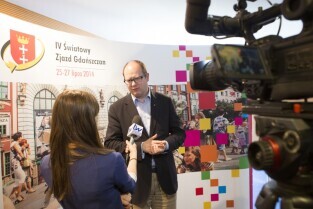 Ośrodek Kultury Morskiej w Gdańsku. Konferencja prasowa poświęcona organizacji IV Światowego Zjazdu Gdańszczan. Nz. Prezydent Gdańska Paweł Adamowicz
