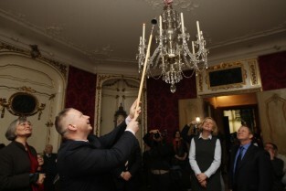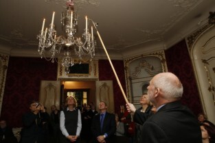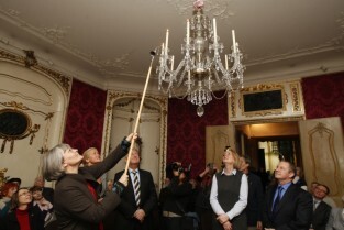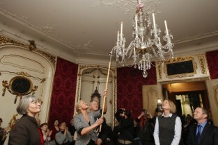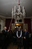 Prezentacja zrekonstruowanego świecznika z Salonu Domu Uphagena w Gdańsku. Obecny świecznik, podobnie jak oryginalny z XVIII w., został wykonany w Anglii. Rekonstrukcji podjęła się działają od 1947r. firma Wilkinson-Chandelier Manufactures & Glass Restorers.