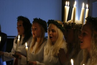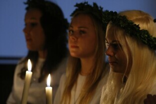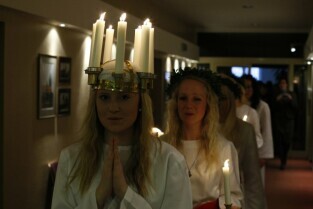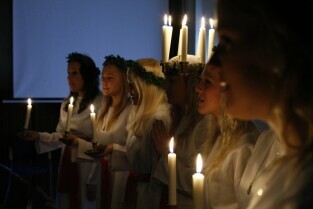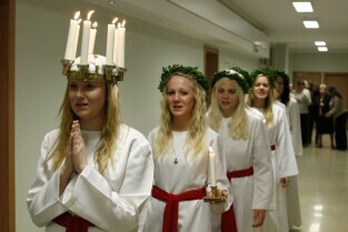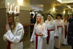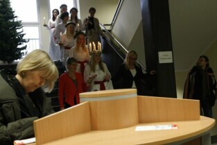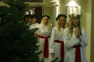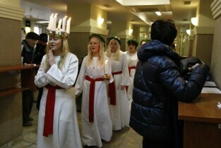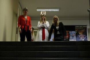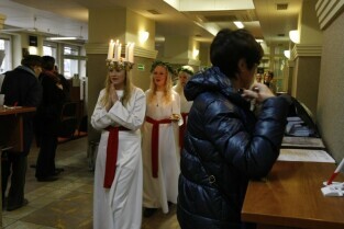 Gdańsk, Urząd Miejski. Wizyta orszaku Świętej Łucji z Kalmaru, który spotkał się z Władzami miasta oraz przeszedł korytarzami magistratu