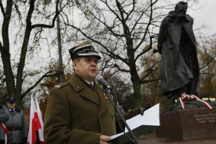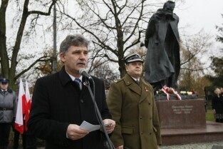 Oficjalne obchody Święta Niepodległości. Gdańsk Strzyża, Pomnik Marszałka Józefa Piłsudskiego. Nz. Wojewoda Pomorski Roman Zaborowski