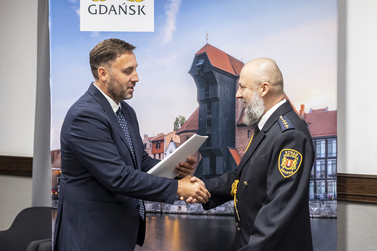 Gdańsk. Z okazji Święta Straży Miejskiej w Gdańsku Piotr Borawski, Z-ca Prezydenta ds. mobilności i bezpieczeństwa, wręczał wyróżniającym się strażnikom miejskim nagrody.
