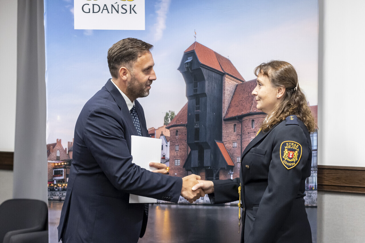 Gdańsk. Z okazji Święta Straży Miejskiej w Gdańsku Piotr Borawski, Z-ca Prezydenta ds. mobilności i bezpieczeństwa, wręczał wyróżniającym się strażnikom miejskim nagrody.