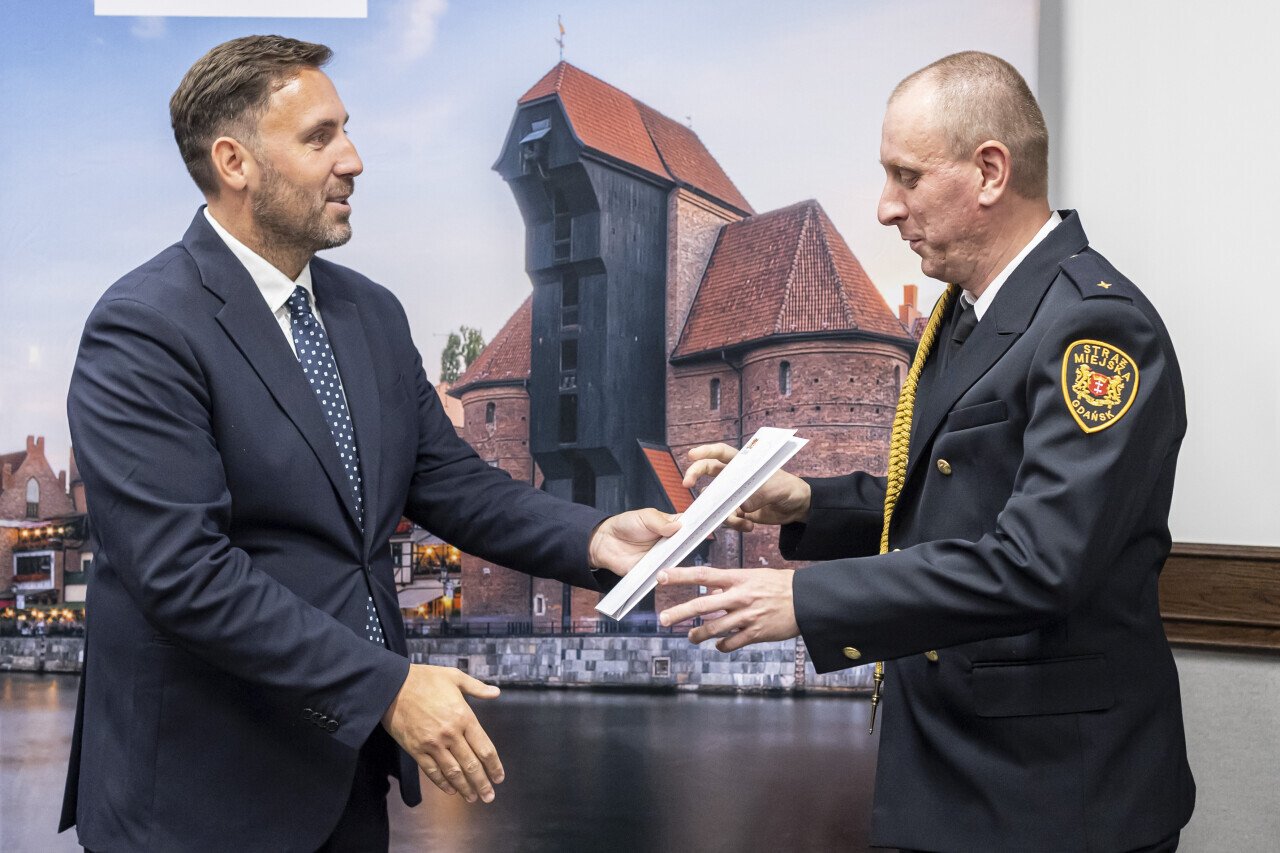 Gdańsk. Z okazji Święta Straży Miejskiej w Gdańsku Piotr Borawski, Z-ca Prezydenta ds. mobilności i bezpieczeństwa, wręczał wyróżniającym się strażnikom miejskim nagrody.