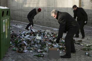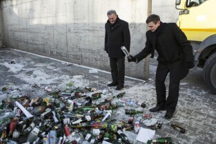 Losowanie nagród w "Sylwestrowym Konkursie Butelkowym". Gdańsk Szadółki, Zakładu Utylizacyjnego. Nz. Dyrektor Biura Rady Miasta Gdańska Piotr Spyra i Przewodniczący Rady Miasta Gdańska Bogdan Oleszek (z tyłu)
