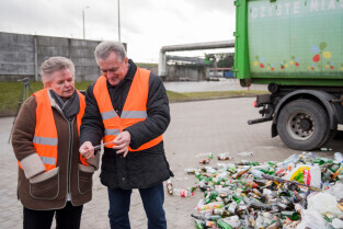 Gdańsk Szadółki. Losowanie nagród w "Sylwestrowym Konkursie Butelkowym". Konkurs zorganizowała Rada Miasta Gdańska i Zakład Utylizacyjny w Gdańsku. Nz. Radna Teresa Wasilewska i Bogdan Oleszek-Przewodniczący Rady Miasta Gdańska