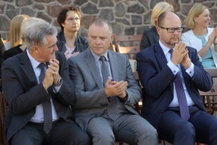 Gdańsk. Szkoła Podstawowa nr 57, otwarcie dwóch nowych boisk. Nz Przewodniczący Rady Miasta Bogdan Oleszek, Dyrektor DRMG Włodzimierz Bartosiewicz i Prezydent Gdańska Paweł Adamowicz.