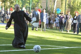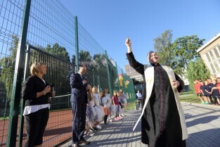 Gdańsk. Szkoła Podstawowa nr 57, otwarcie dwóch nowych boisk. Nz Ks. Kanonik Ludwik Kowalski.