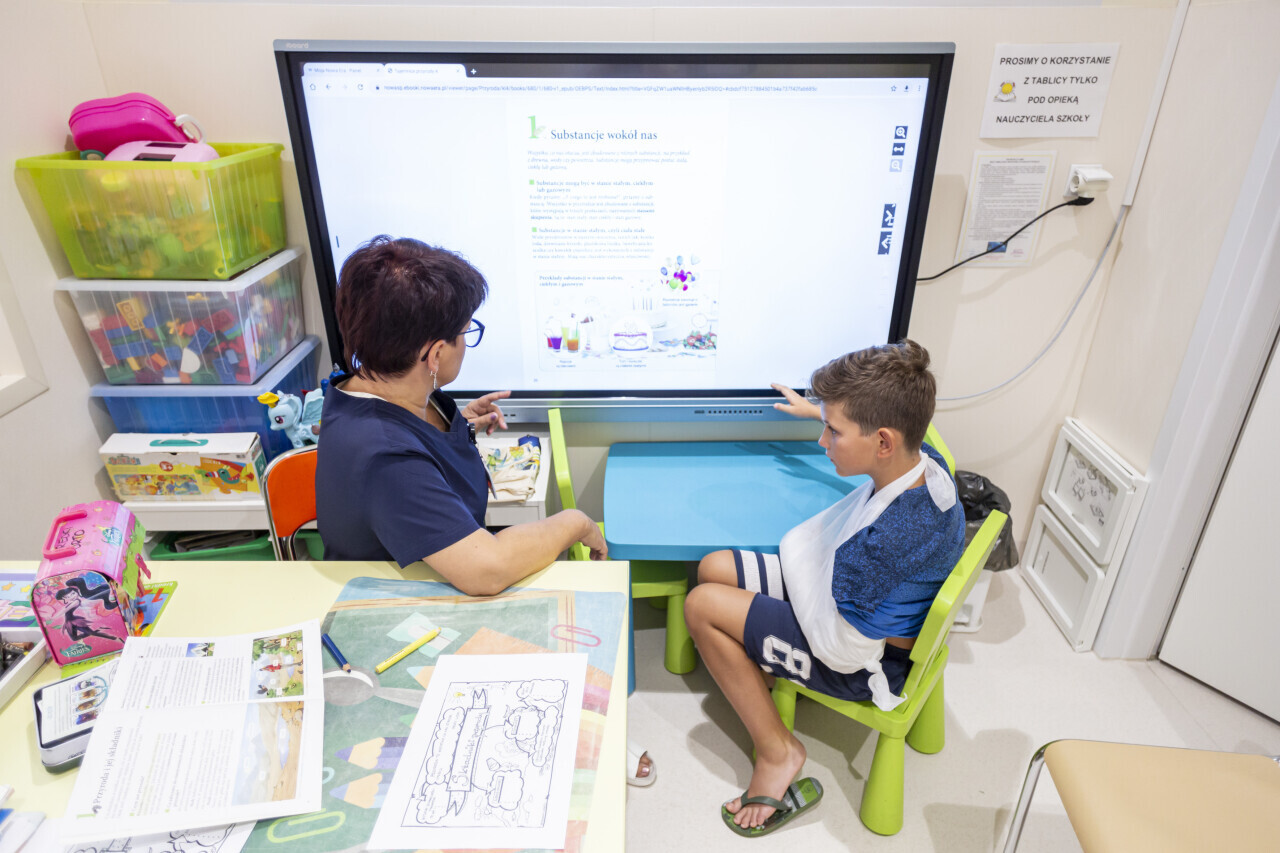 Gdańsk. Szkoła Podstawowa Nr 9., której nauczyciele pracują na odziałach dziecięcych szpitala Copernicus. Nz. Alina Napiórkowska, nauczycielka przyrody i jej podopieczny Michał z klasy 4.