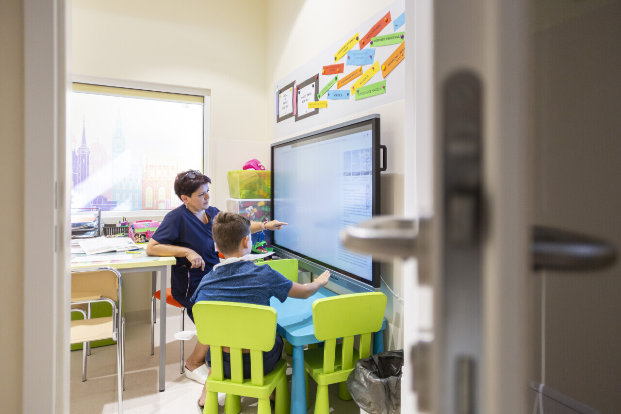 Gdańsk. Szkoła Podstawowa Nr 9., której nauczyciele pracują na odziałach dziecięcych szpitala Copernicus. Nz. Alina Napiórkowska, nauczycielka przyrody i jej podopieczny Michał z klasy 4.