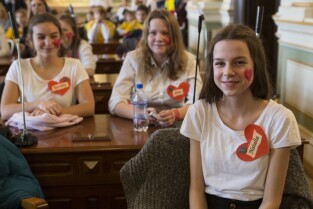 Gdańsk, Nowy Ratusz. Rozstrzygnięcie konkursu Szkoła Społecznie Wrażliwa. Nz. laureaci w kategorii podstawówek (ex aequo): SP nr 80
