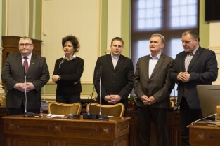 Gdańsk, Nowy Ratusz. Rozstrzygnięcie konkursu Szkoła Społecznie Wrażliwa. Nz. członkowie jury konkursu, od lewej: Z-ca Prezydenta Gdańska Piotr Kowalczuk, Przewodnicząca Komisji Edukacji Rady Miasta Gdańska Żaneta Geryk, Z-ca Dyrektora Caritas Gdańsk Ks. Piotr Brzozowski, Przewodniczący Rady Miasta Gdańska Bogdan Oleszek, Radny Miasta Gdańska Piotr Gierszewski
