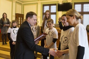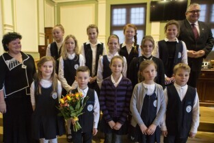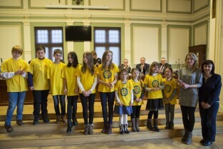 Gdańsk, Nowy Ratusz. Rozstrzygnięcie konkursu Szkoła Społecznie Wrażliwa. Nz. laureaci w kategorii podstawówek (ex aequo): SP nr 55