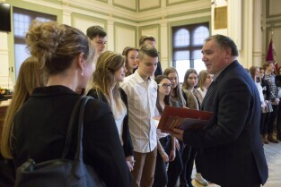 Gdańsk, Nowy Ratusz. Rozstrzygnięcie konkursu Szkoła Społecznie Wrażliwa. Nz. Gimnazjum nr 31 - laureaci w kategorii gimnazja, nagrodę wręcza Z-ca Prezydenta Gdańska Piotr Kowalczuk