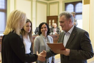 Gdańsk, Nowy Ratusz. Rozstrzygnięcie konkursu Szkoła Społecznie Wrażliwa. Nz. jedną z nagród wręcza Przewodnicząca Komisji Edukacji Rady Miasta Gdańska Żanet Geryk