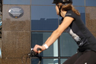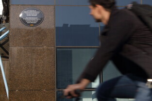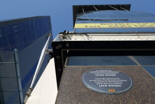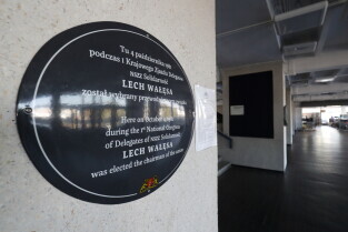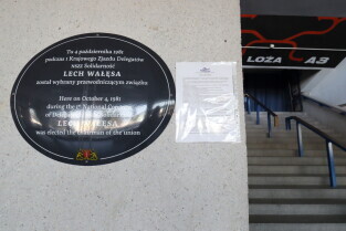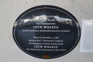 Gdańsk. Szlak Wolności Lecha Wałęsy. Nz. Tablica w Hali Olivia, gdzie jesienią 1981 r. odbywał się I Krajowy Zjazd Delegatów NSZZ „Solidarność”, podczas którego Lech Wałęsa 4 października 1981 r. został wybrany przewodniczącym związku.