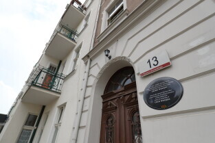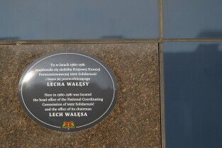 Gdańsk. Szlak Wolności Lecha Wałęsy. Nz. Tablica przy ulicy Dmowskiego 13 – na kamienicy, w której jesienią 1980 r. mieściło się pierwsze, tymczasowe biuro Międzyzakładowego Komitetu Założycielskiego Niezależnego Samorządnego Związku Zawodowego (jeszcze bez dodatku „Solidarność” w nazwie).