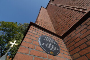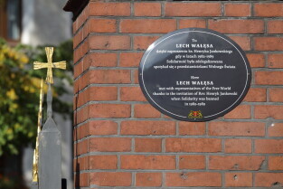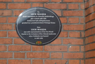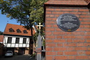 Gdańsk. Szlak Wolności Lecha Wałęsy. Nz. Tablica na ścianie budynku plebanii Bazyliki Św. Brygidy przy ul. Profesorskiej 17, gdzie po wprowadzeniu stanu wojennego odbywały się spotkania działaczy zdelegalizowanej Solidarności, m.in. Lecha Wałęsy, Tadeusza Mazowieckiego, Jacka Kuronia, Adama Michnika, Bronisława Geremka, Andrzeja Gwiazdy, Marka Jurka oraz ks. Jerzego Popiełuszki.