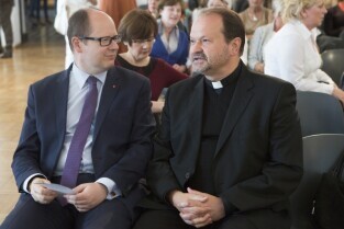 Debata edukacyjna "Sztuka uczenia. Rzecz o pięknie”. Muzeum Narodowe w Gdańsku. Nz. Prezydent Gdańska Paweł Adamowicz i ks. Krzysztof Niedałtowski