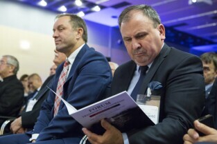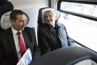 11. Międzynarodowe Targi Kolejowe TRAKO. Gdańsk, Amber Expo. Prezentacja PESA DART - nowego pociągu dla PKP Inter City. Nz. Podsekretarz Stanu w Ministerstwie Infrastruktury i Rozwoju Sławomir Żałobek i Metropolita Gdański Abp Sławoj Leszek Głódź