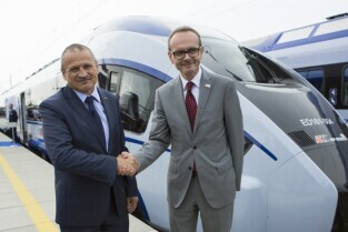 11. Międzynarodowe Targi Kolejowe TRAKO. Gdańsk, Amber Expo. Prezentacja PESA DART - nowego pociągu dla PKP Inter City. Nz. Prezes PESA Bydgoszcz SA Tomasz Zaboklicki i Członek Zarządu PKP Inter City Piotr Rybotycki (po prawej)