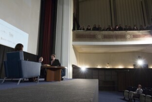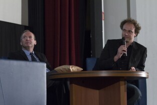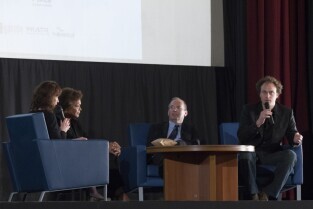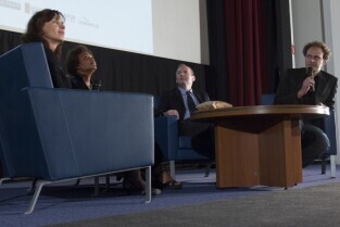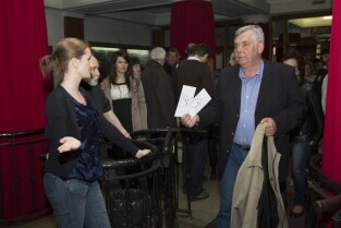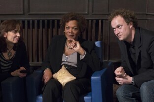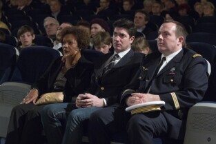 Gdańsk, Kino Neptun. Polska premiera filmu "Tabarly" w reż. Pierra Marcela, opowiadającego historię żeglarza regatowego Erica Tabarly, zmarłego podczas rejsu w 1998 r. Nz. od prawej reżyser Pierre Marcel i Jacqueline Tabarly, żona Erica Tabarly'ego