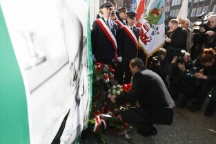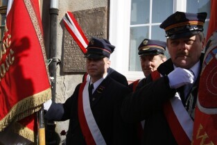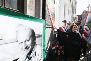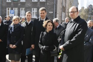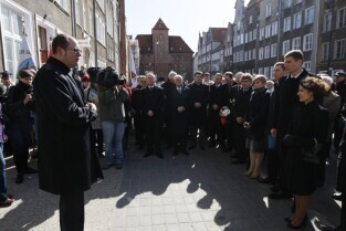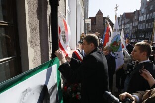 Odsłonięcie pamiątkowej tablicy poświęconej Maciejowi Płażyńskiemu, który zginął w katastrofie prezydenckiego samolotu pod Smoleńskiem. Gdańsk, ul. Szeroka - była siedziba Biura Poselskiego Macieja Płażyńskiego