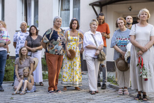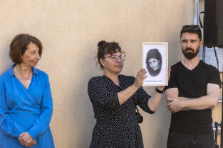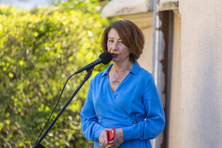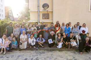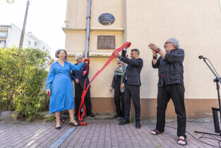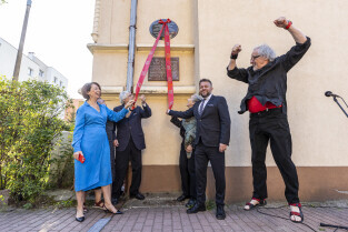 Gdańsk. Na kamienicy przy ulicy Batorego we Wrzeszczu, zawisła tablica upamiętniająca urodzonego w tym domu Michaela Meschke, słynnego twórce teatru lalek. Nz. Radna Barbara Imianowska