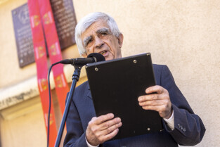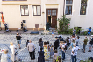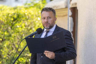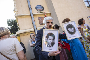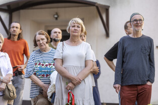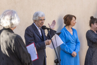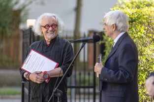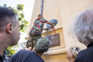 Gdańsk. Na kamienicy przy ulicy Batorego we Wrzeszczu, zawisła tablica upamiętniająca urodzonego w tym domu Michaela Meschke, słynnego twórce teatru lalek. Nz. Były radny i działacz społeczny Andrzej Stelmasiewicz